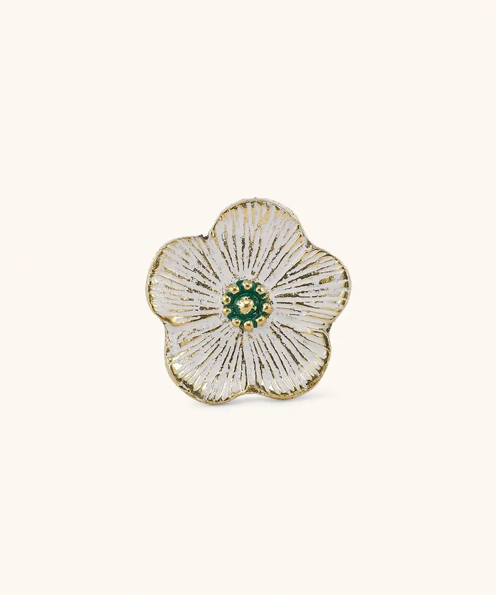 Ajoutez une touche délicate et éco-responsable à vos meubles avec le Bouton Fleur Faye Blanc. Fabriqué en laiton recyclé, ce bouton de taille moyenne (5 x 4,5 x 7 cm) arbore un magnifique design de fleur blanche avec des détails verts subtils en son centre. Parfait pour moderniser vos tiroirs, armoires ou placards, il allie durabilité et style intemporel.