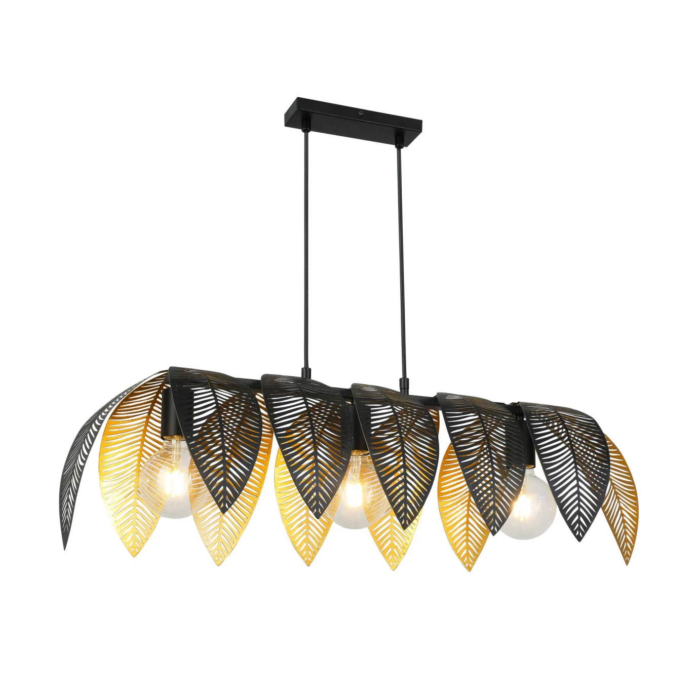 Ambiance tropicale originale avec la somptueuse suspension trois points lumineux Vesca ! Douze feuilles de palmier en métal fer souple noir et doré abritent trois ampoules choisies par vos soins.